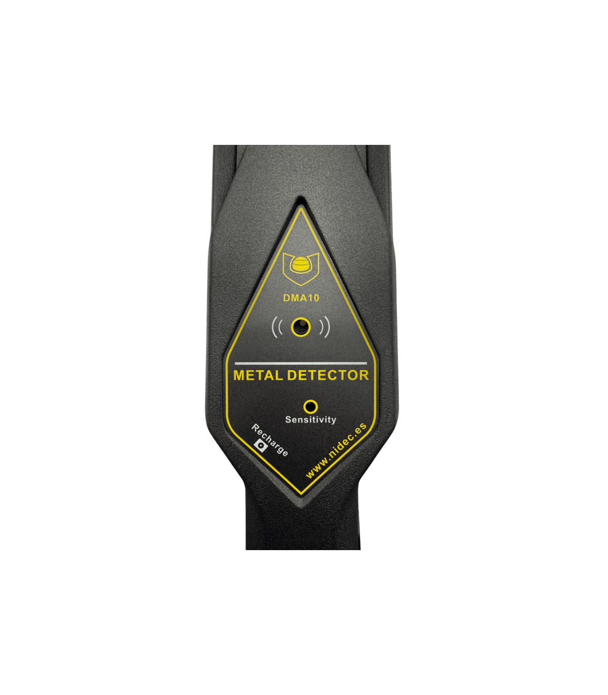 El detector de metales portátil de alto rendimiento NIDEC DMA10. Fácil de usar (sin ajustes), con doble alarma (sonido/vibración), sensibilidad ajustable y batería recargable. Diseño robusto y ligero para uso profesional intensivo en seguridad y controles.