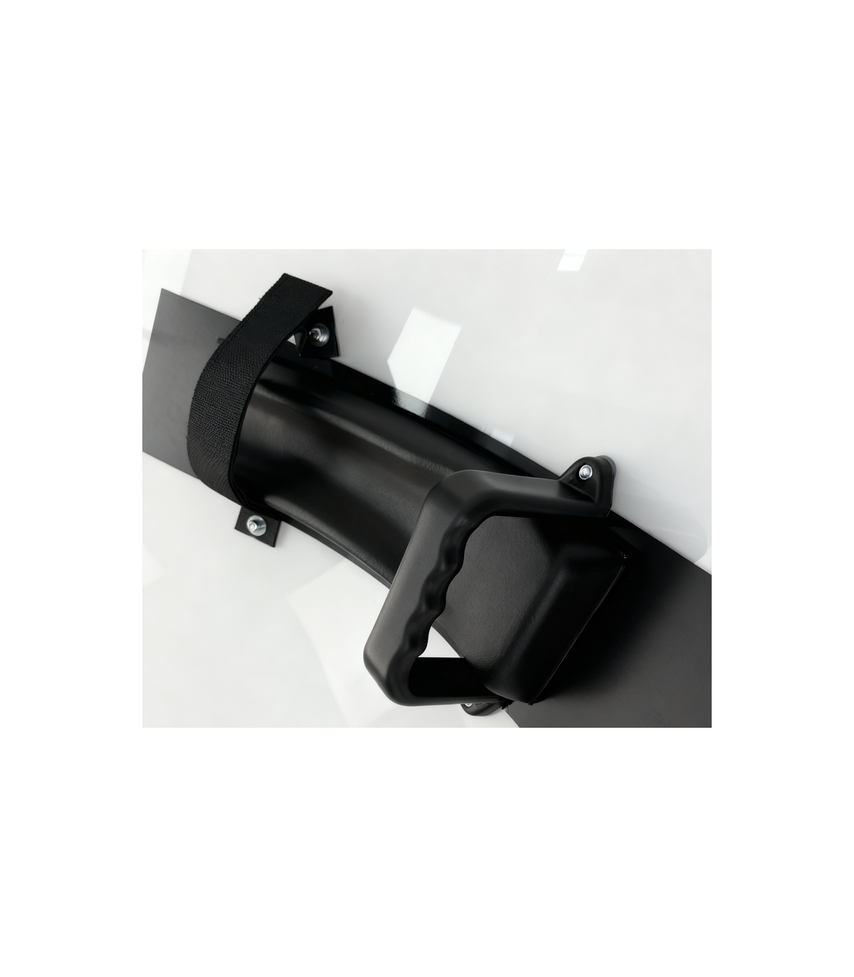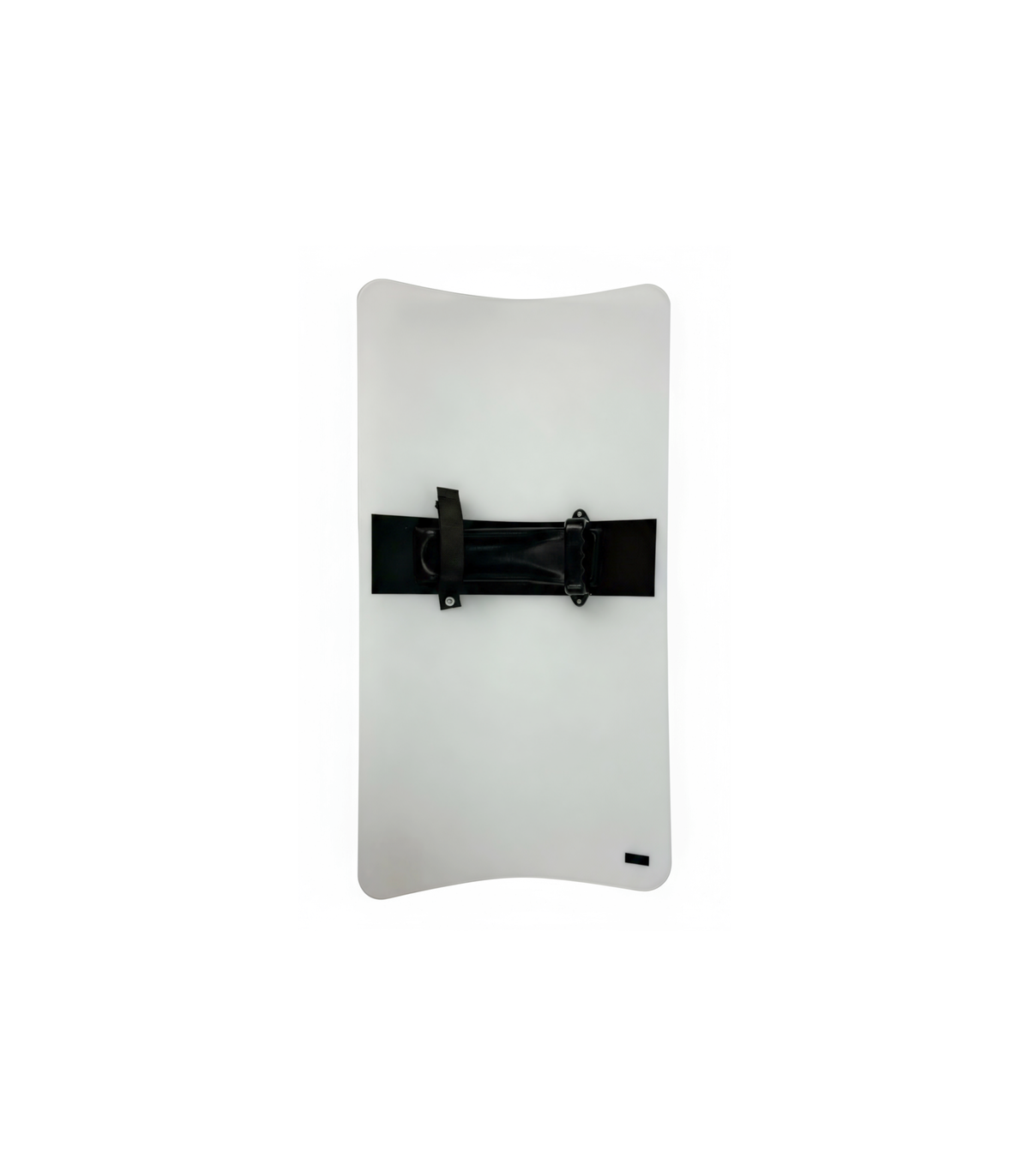 - Sistema de Sujeción Ambidextro: El escudo puede ser configurado fácilmente por el usuario para uso con la mano derecha o izquierda. Incluye un asa ergonómica con hendiduras para los dedos y un mango de polipropileno no conductivo, complementado con un cierre de velcro ajustable para el antebrazo que permite una liberación rápida si es necesario.