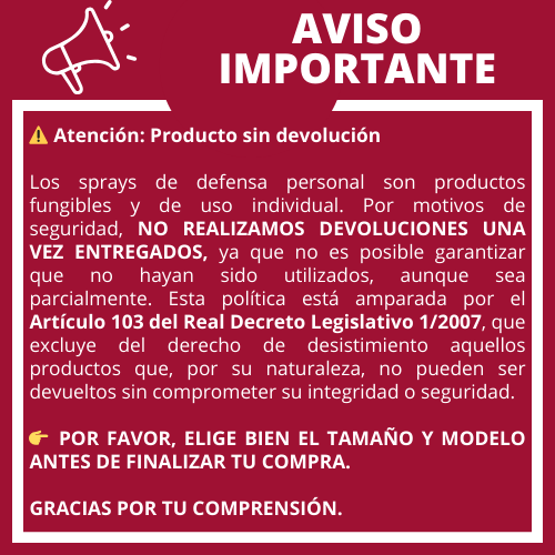 Porque los sprays de defensa son el único sistema de defensa personal legalmente permitido. Ya que el OC no deja de ser un componente alimenticio. Así que; no tendrás problemas si la policía te lo ve en circunstancias normales. Su funcionamiento es sencillo; apuntas con él a la cara de tu agresor, presionas el difusor y el gel le obligará a parar, por el intenso y fuerte escozor que sufrirá sobre todo en los ojos. Esto te dará tiempo a escapar y llamar a la policía. Nuestros sprays de pimienta de Sabre Red son los que contienen mayor proporción de OC del mercado, lo que garantiza la máxima potencia de detención a una distancia segura de hasta 5 metros. Este modelo, el SPR10, proyecta su contenido en forma de gel balístico, es mejor para ti porque puedes utilizarlo aunque haya viento, y si es en una habitación, no quedará en el ambiente. Además, te gustará saber que este gel además de incapacitar al agresor, lo marcará con un compuesto ultravioleta para que pueda ser identificado hasta 48 horas después del incidente.