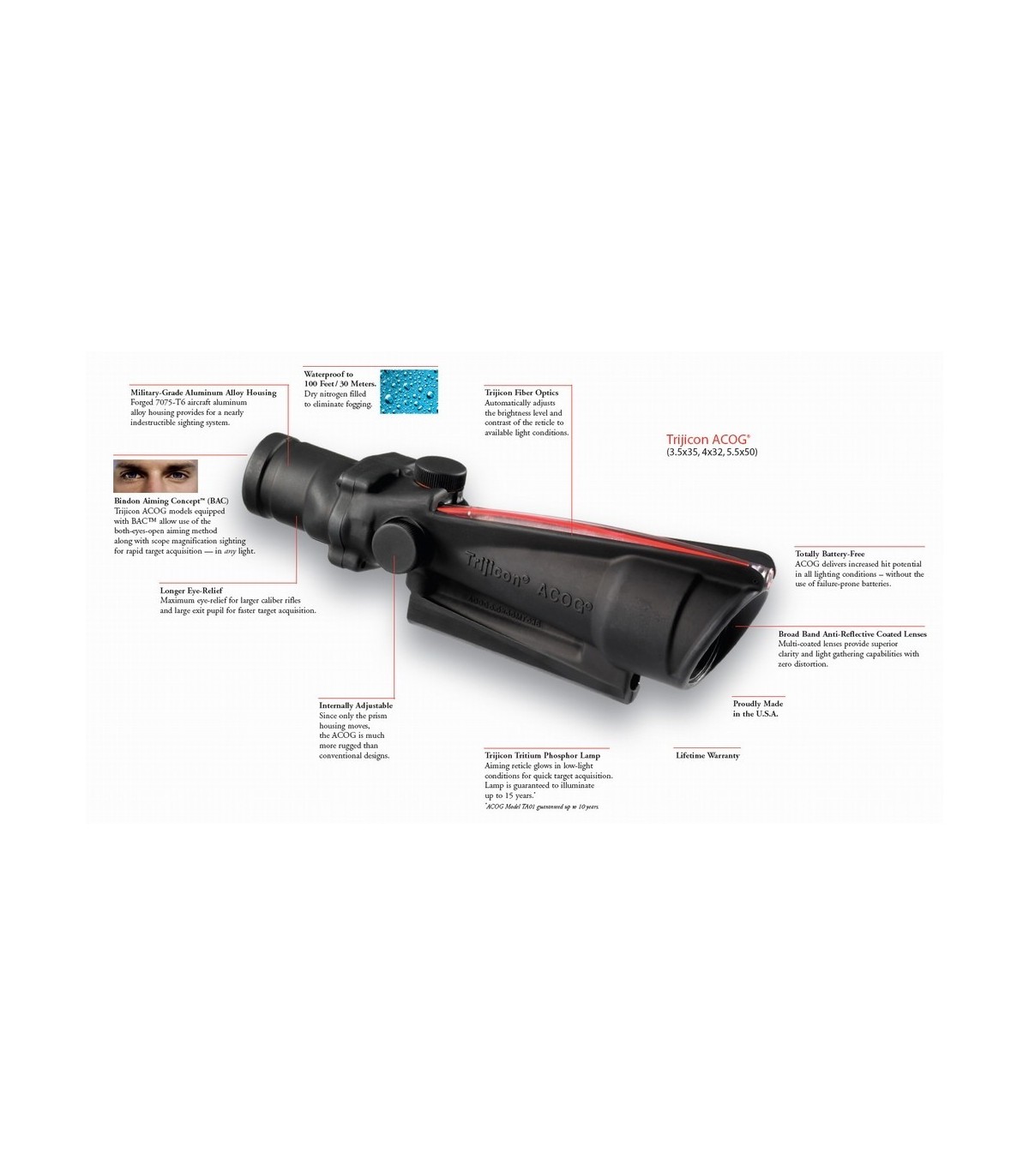 Sus sorprendentes prestaciones han convertido el ACOG en la óptica oficial de los rifles de combate de la U.S. Marine Corps y parte del equipo estándar de todas las Special Operations Forces y la U.S.Army.